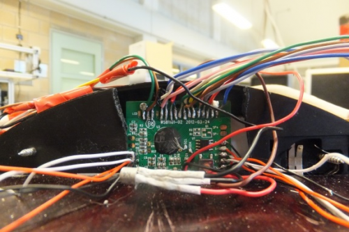 Onneksemme piirilevyssä oli testipaikat jokaiselle näyttöön menevälle pinnille, joten "vakoilujohdot" oli helppo juottaa kiinni. Juotimme kaikkiaan 19 johtoa vaa'an piirilevyyn: 15 johtoa näytön lukemiseen, 2 johtoa syöttääksemme virtaa ja 2 johtoa vaa'an kontrolloimiseen. Antureilta tulevat johdot oli tehdasjuotettu melko heikosti, joten niitä piti jatkuvasti korjailla. Varovaisuudella säästää aikaa :)
