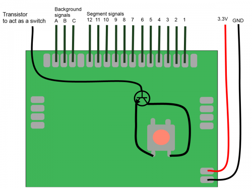 Tarkoituksemme on siis lukea arduinon avulla henkilövaa'an mittaamia arvoja ja mielestämme helpoin ratkaisu on lukea lcd-näytölle meneviä signaaleja, samalla tavoin kuin Dušan Stojković teki blogissaan. Siirtämällä piirilevyn ja näytön välissä olevaa kontaktiliuskaa saimme määriteltyä mitkä levyn pinneistä vaikuttivat mihinkin näytön segmenttiin.