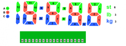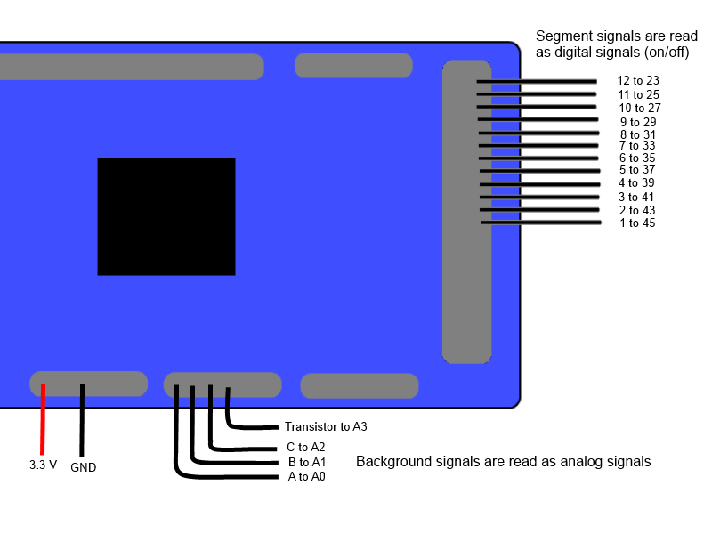 Tarkoituksemme on siis lukea arduinon avulla henkilövaa'an mittaamia arvoja ja mielestämme helpoin ratkaisu on lukea lcd-näytölle meneviä signaaleja, samalla tavoin kuin Dušan Stojković teki blogissaan. Siirtämällä piirilevyn ja näytön välissä olevaa kontaktiliuskaa saimme määriteltyä mitkä levyn pinneistä vaikuttivat mihinkin näytön segmenttiin.